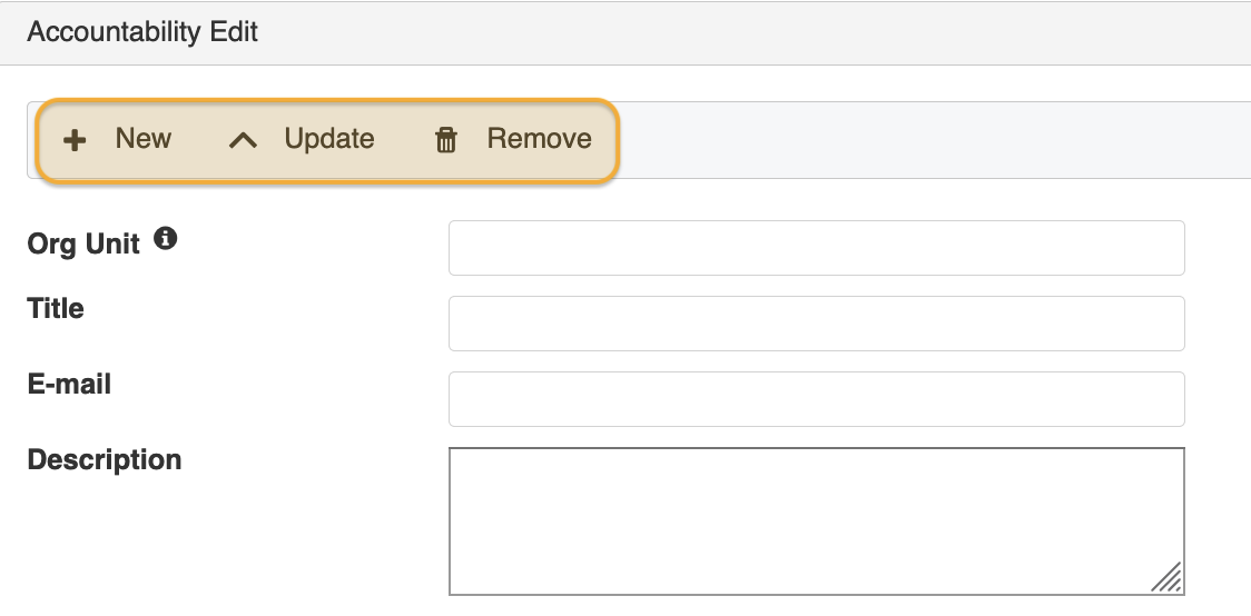 To define a new Accountability, click on the button New and maintain the fields Org Unit, title, email including a brief textual description. It is recommended to use the divisional affiliation of the person for Org Unit as this will be used as the display name.