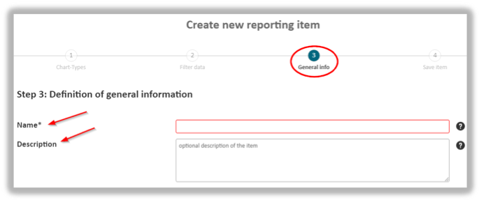 During the third step you provide general information as it pertains to the report. Here you are asked to give a name and a description. The Name text field is again mandatory.