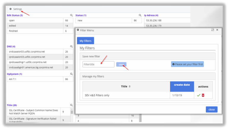 Once done, select the Settings represented by the gear wheel in the top left corner. In the following filter menu give the filter a name and save it. To call it up later enter the Settings dialogue and select your filters from the lower part of the window.