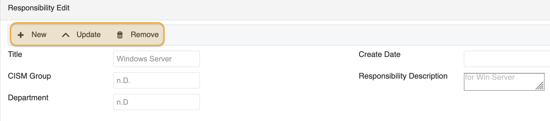 To define a new Responsibility, click on the button New and maintain the fields Title, CISM Group, Department including a brief textual description.
