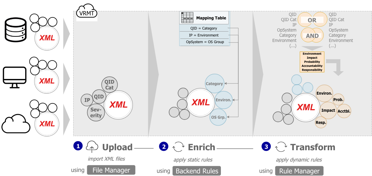 - enriched files are further transformed via Rule Manager to reflect detailed information about the vulnerability impact and the recipients within the organization who will ultimately decide about patching the weakness.
