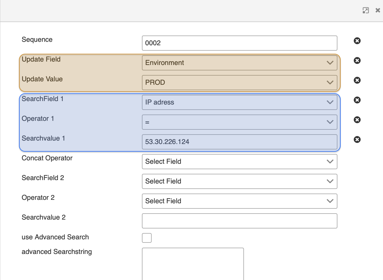 Now we configure the component of the logical expression. Select the drop-down box of attribute SearchField 1. You receive the list of all configured attributes. Select IP address here. Next click in the text field of Searchvalue 1 and enter the value 53.30.226.124.