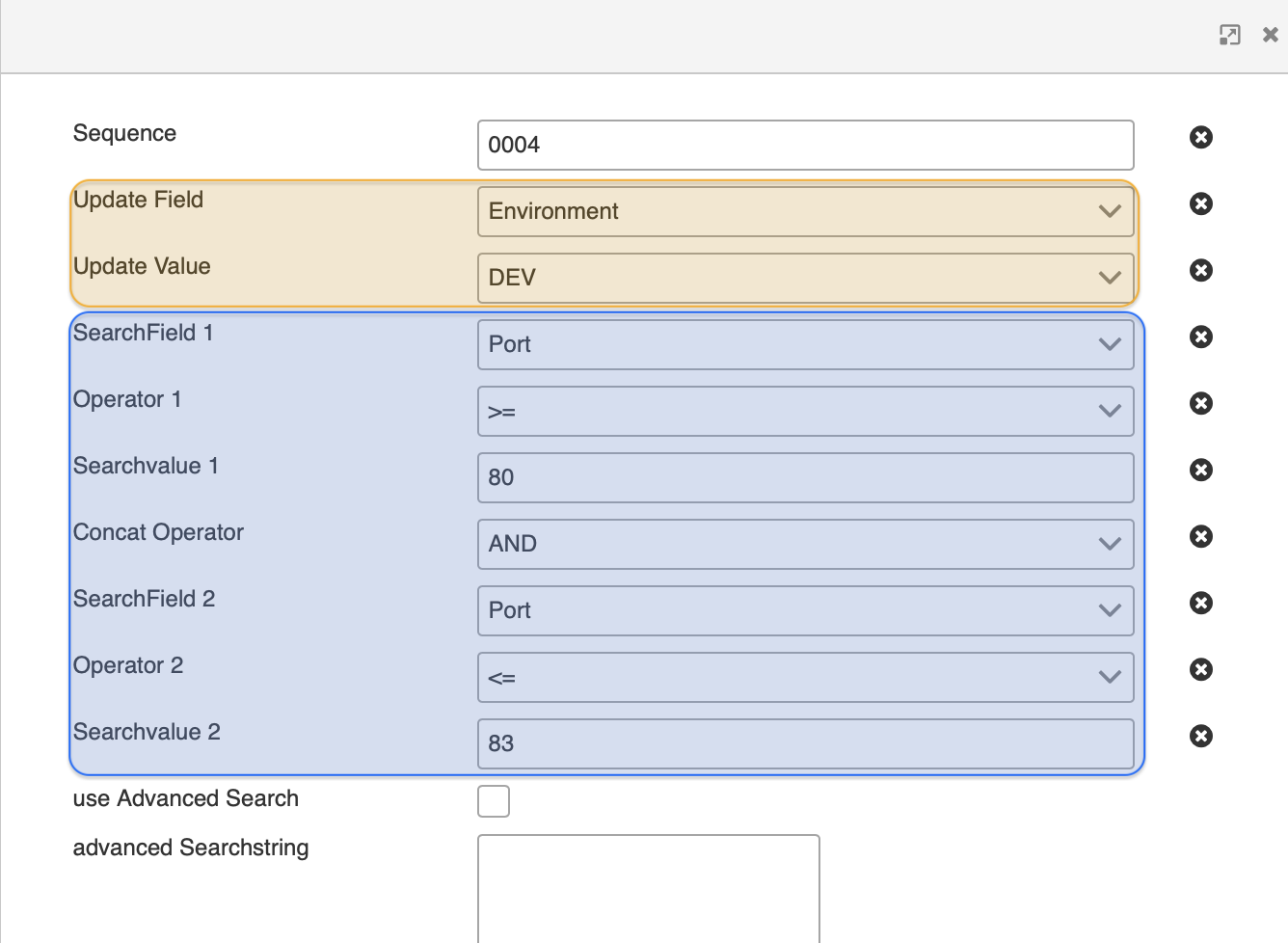 We click the drop-down box of attribute SearchField 1. You again receive the list of all configured attributes. Select Port here. For the Operator 1 we select the value ">=". Go ahead and click in the text field of Search Value 1 and enter 80. Set the Concat Operator to AND. Similarly to above, select Port for SearchField 2. The Operator 2 is set to "<=". The Search Value 2 is set to 83.