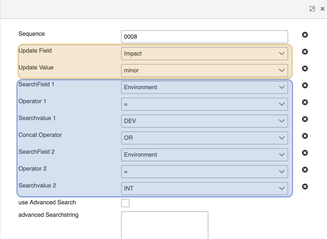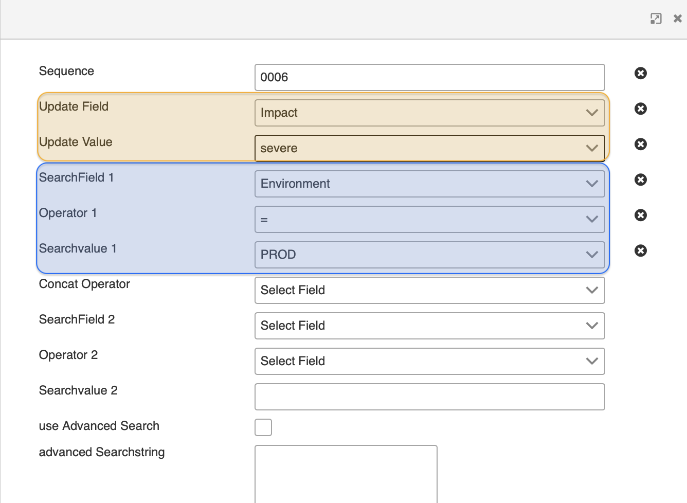 We click the drop-down box of attribute SearchField 1. Select Environment here. For the Operator 1 we select the value "=". Go ahead and click on Search Value 1 and select PROD.