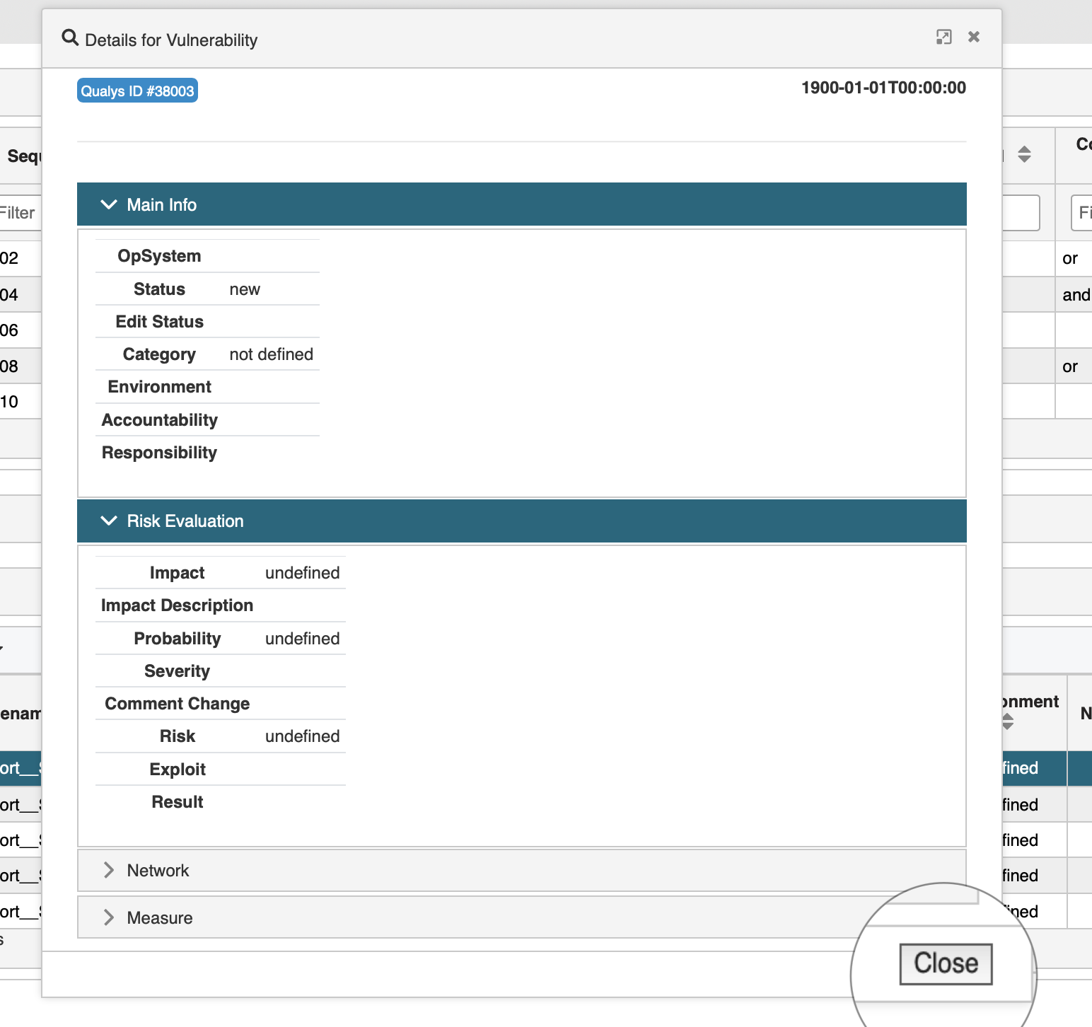 The overview categorizes the alerts attributes in Main Info, Risk Evaluation, Network, and Measure. Using this view you gain a much more clear and compact insight into details. In addition you immediately see which attributes are still empty and need to be populated. When done click the Close button to leave the view.