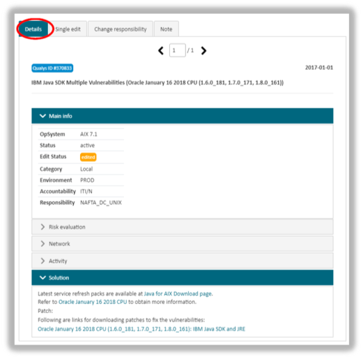 Selecting the Details menu leads to a maintenance dialogue that informs about further details of the vulnerability. The dialogue contains the following categories as shown in the next illustration: